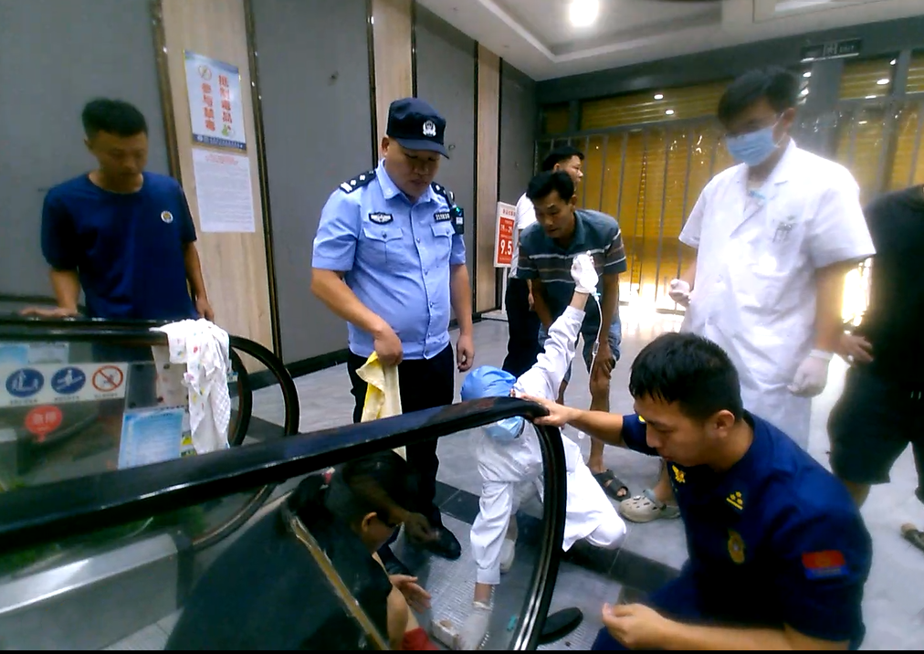 2025年8月5日15時(shí)許,遂溪縣公安局城月派出所民警接到城月鎮(zhèn)政府工作人員電話求助,稱該鎮(zhèn)某商場一名小孩被卷到扶手電梯里,需要出警協(xié)助救援。接報(bào)后,民警第一時(shí)間趕到事發(fā)現(xiàn)場,積極配合先期到達(dá)的消防救援人員展開施救。為保障救援順利進(jìn)行,民警立即疏散在場無關(guān)人員。