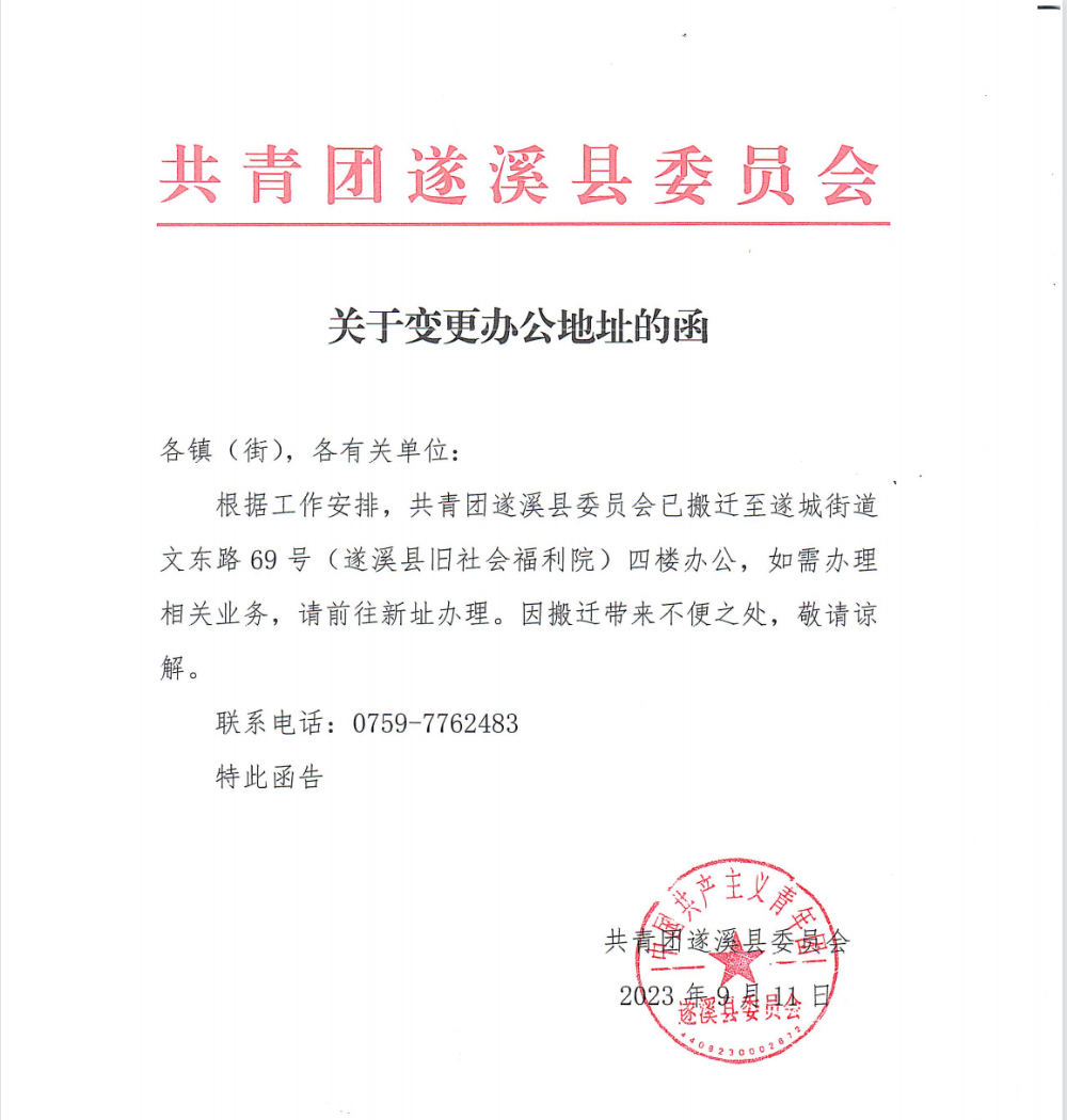共青團(tuán)遂溪縣委員會(huì)關(guān)于更改辦公地址通知