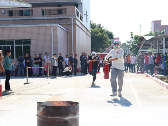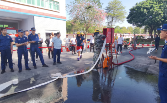 消防安全技能競賽則通過2人組室內(nèi)消火栓快速出水操、2人組原地佩戴防毒面具并使用滅火器滅真火等實操項目,考察參賽人員使用消防器材應對火情的熟練程度。