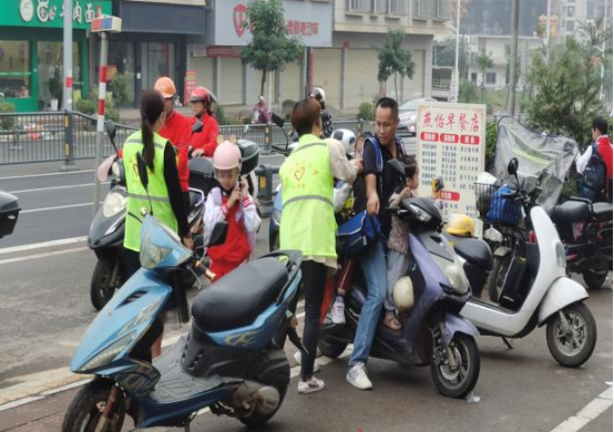 (圖為遂城第六小學(xué)“護(hù)學(xué)崗”成員引導(dǎo)學(xué)生及家長規(guī)范佩戴頭盔)