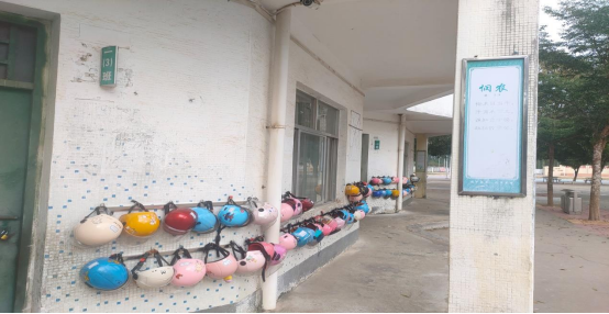 (圖為港門鎮(zhèn)中心小學(xué)學(xué)生頭盔存放區(qū)域)