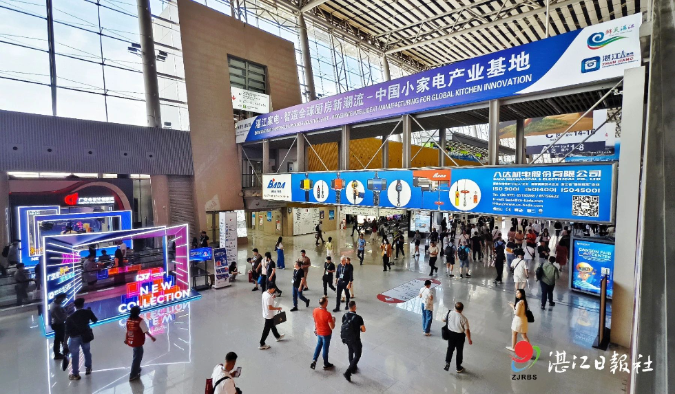 本屆廣交會展館內(nèi),人來人往十分熱鬧。上方懸掛著 “湛江家電?智造全球廚房新潮流 - 中國小家電產(chǎn)業(yè)基地” 等宣傳橫幅,展現(xiàn)產(chǎn)業(yè)特色。