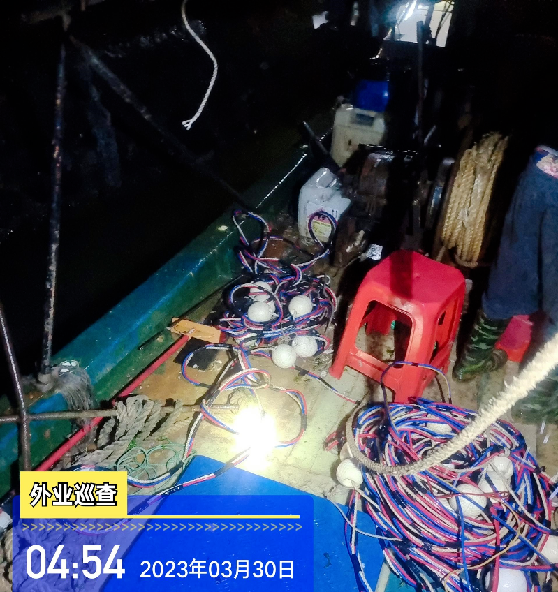 3月30日凌晨4時30分,江洪中隊聯(lián)合鎮(zhèn)政府執(zhí)法人員在江洪漁港夜巡時發(fā)現(xiàn)一艘?guī)в须娋€網(wǎng)具的船舶??吭诖a頭邊,執(zhí)法人員登船檢查并將該船扣押回江洪中隊進一步調(diào)查。