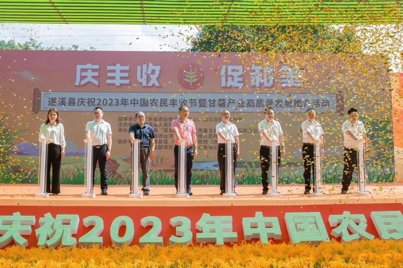 活動最后,與會領(lǐng)導(dǎo)、嘉賓上臺進(jìn)行豐收節(jié)活動啟動儀式,隨著領(lǐng)導(dǎo)、嘉賓們共同按下啟動鍵,全場金鼓齊鳴、禮炮鳴放,遂溪縣慶祝2023年中國農(nóng)民豐收節(jié)暨甘薯產(chǎn)業(yè)高質(zhì)量發(fā)展推介活動正式啟動。