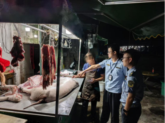 凌晨,靜謐的鄉(xiāng)村仍在沉睡,樂民農(nóng)貿(mào)市場的豬肉交易區(qū)已亮起燈火?!澳愫?,請出示該豬肉的‘兩證兩章’?!眻?zhí)法人員的聲音打破檔口的寧靜。