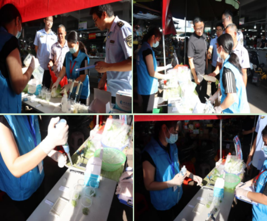 我們?cè)谵r(nóng)貿(mào)市場人流密集區(qū)域設(shè)置便民檢測攤位,聚焦群眾最關(guān)心的蔬菜、水果等日常食用農(nóng)產(chǎn)品,重點(diǎn)提供農(nóng)藥殘留項(xiàng)目快速檢測服務(wù)。檢測過程全程公開透明,技術(shù)人員嚴(yán)格按照規(guī)范流程完成樣品登記、取樣剪碎、溶液萃取、滴卡檢測等操作,并同步講解檢測原理與關(guān)鍵步驟,讓群眾直觀了解檢測全過程。