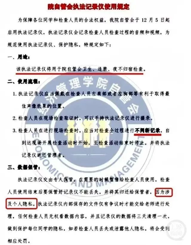 近日,江蘇宿遷學(xué)院經(jīng)濟(jì)管理學(xué)院自管會(huì)發(fā)文稱,檢查人員從12月5日起啟用執(zhí)法記錄儀,用于自管會(huì)衛(wèi)生、違禁、夜不歸宿檢查。