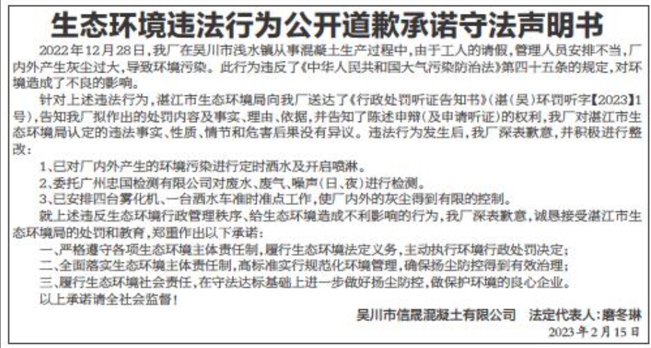 吳川市信晟混凝土有限公司于2023年2月17日在湛江日?qǐng)?bào)A05版登報(bào),公開(kāi)道歉并作出守法承諾。