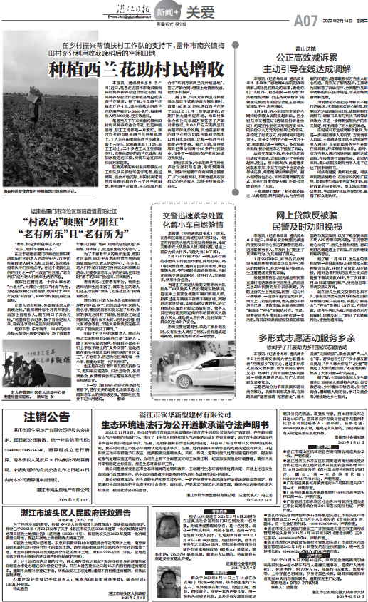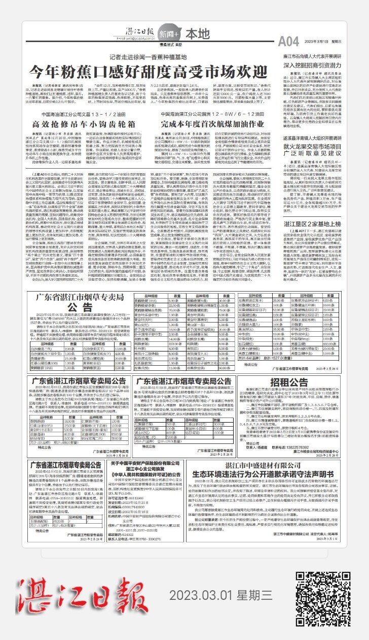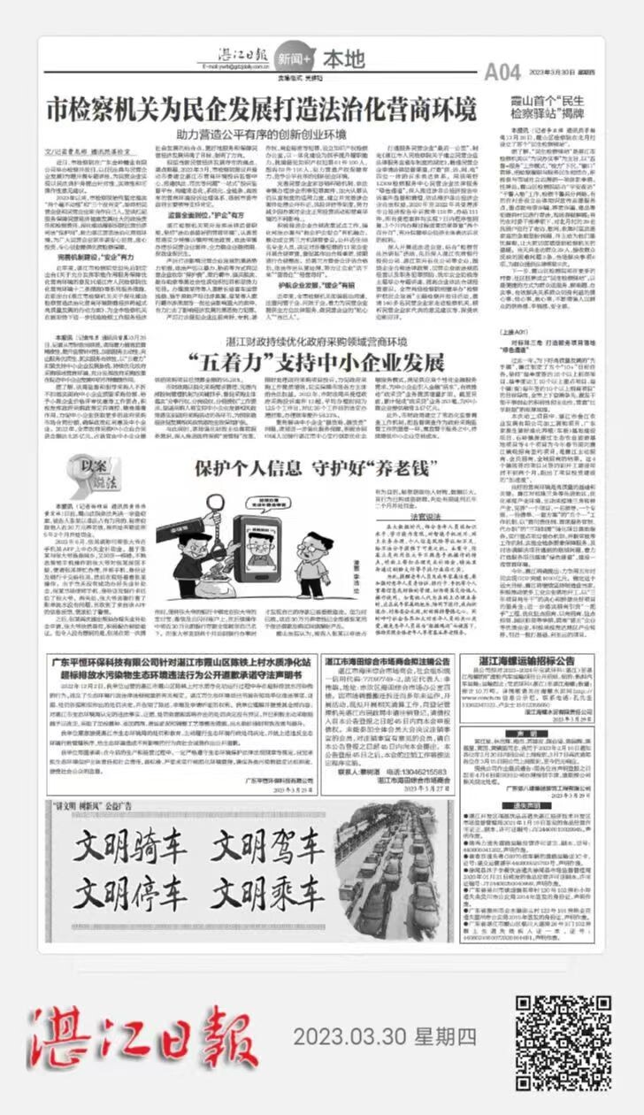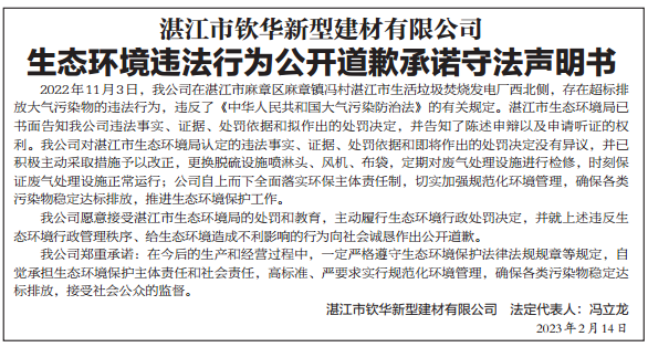 湛江市欽華新型建材有限公司于2023年2月14日在《湛江日?qǐng)?bào)》A07版登報(bào)公開(kāi)道歉、承諾守法。