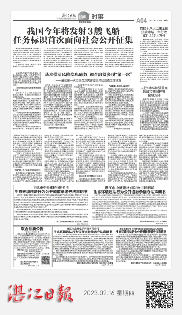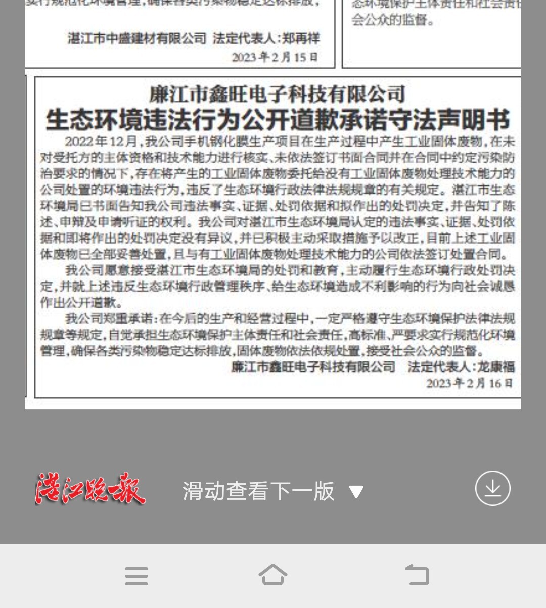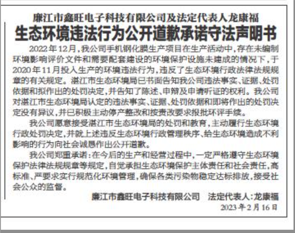 廉江市鑫旺電子科技有限公司于2023年2月16日在《湛江日?qǐng)?bào)》A04版登報(bào)對(duì)其違反規(guī)定委托他人處置工業(yè)固體廢物的行為進(jìn)行公開(kāi)道歉。