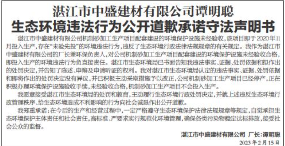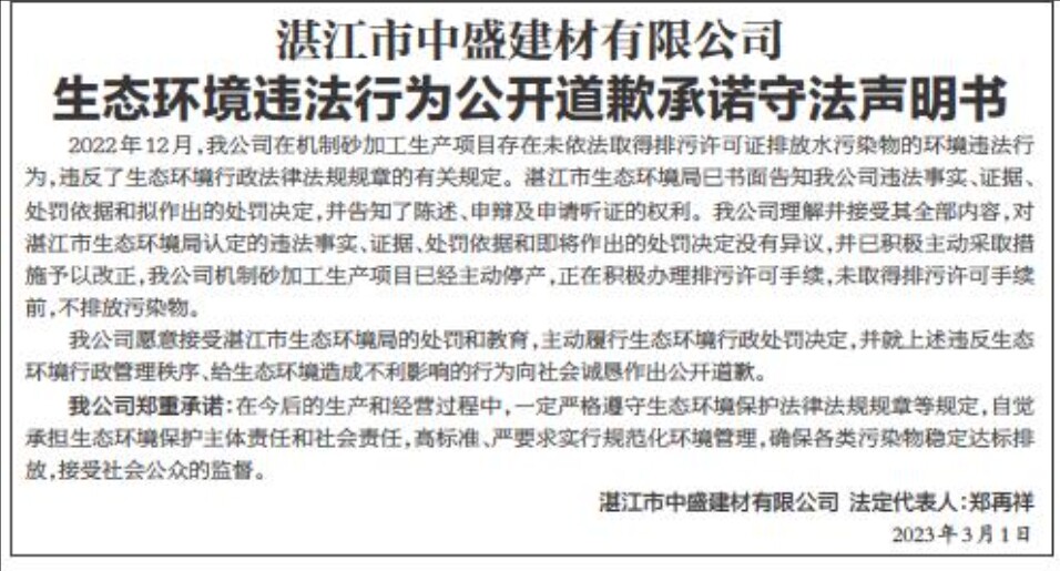湛江市中盛建材有限公司于2023年3月1日在《湛江日?qǐng)?bào)》A04版登報(bào)對(duì)其未取得排污許可證排放水污染物的行為進(jìn)行公開(kāi)道歉。