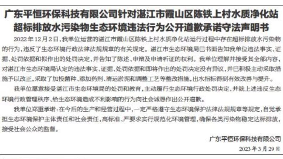 廣東平恒環(huán)??萍加邢薰居?023年3月30日在《湛江日?qǐng)?bào)》A04版登報(bào)對(duì)其超標(biāo)排放水污染物的行為進(jìn)行公開(kāi)道歉。
