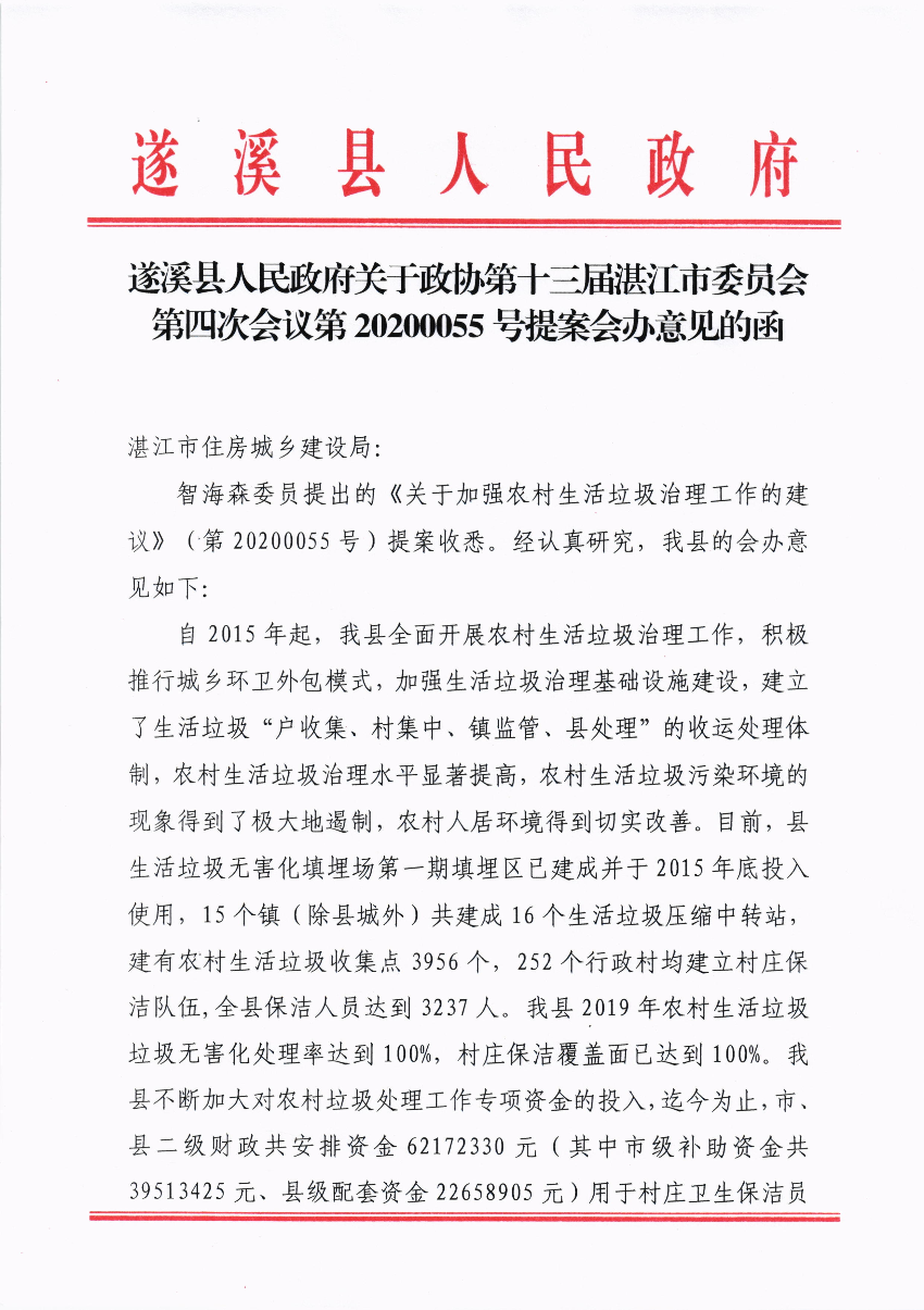 遂溪縣人民政府關(guān)于政協(xié)第十三屆湛江市委員會(huì)第四次會(huì)議第20200055號(hào)提案會(huì)辦意見的函
