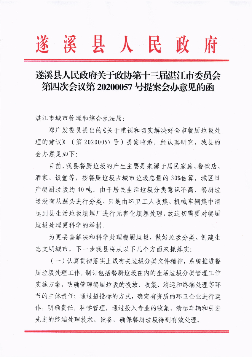 遂溪縣人民政府關(guān)于政協(xié)第十三屆湛江市委員會(huì)第四次會(huì)議第20200057號(hào)提案會(huì)辦意見的函
