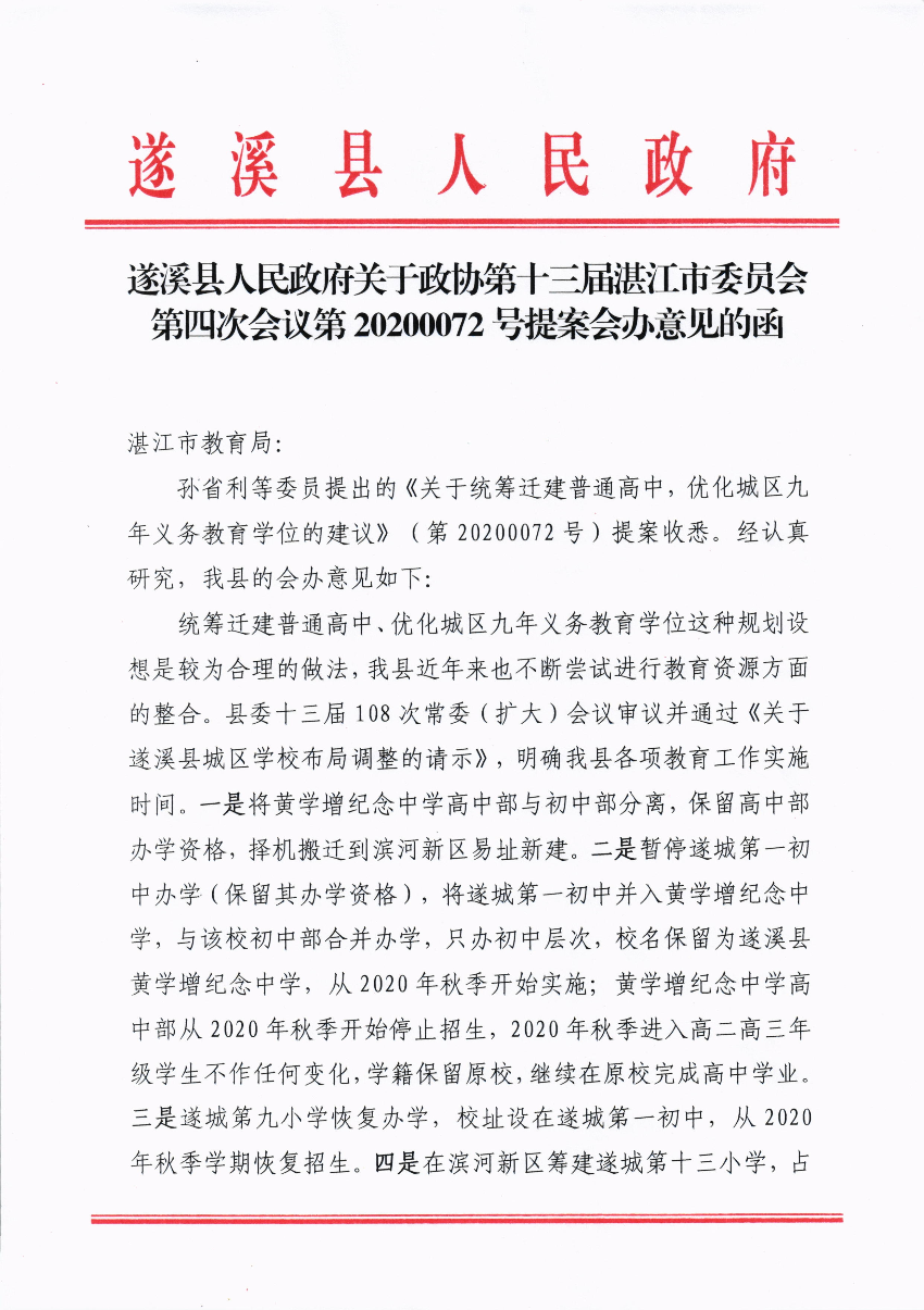 遂溪縣人民政府關(guān)于政協(xié)第十三屆湛江市委員會第四次會議第20200072號提案會辦意見的函