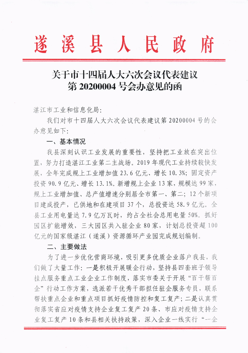 關(guān)于市十四屆人大六次會議代表建議第20200004號會辦意見的函