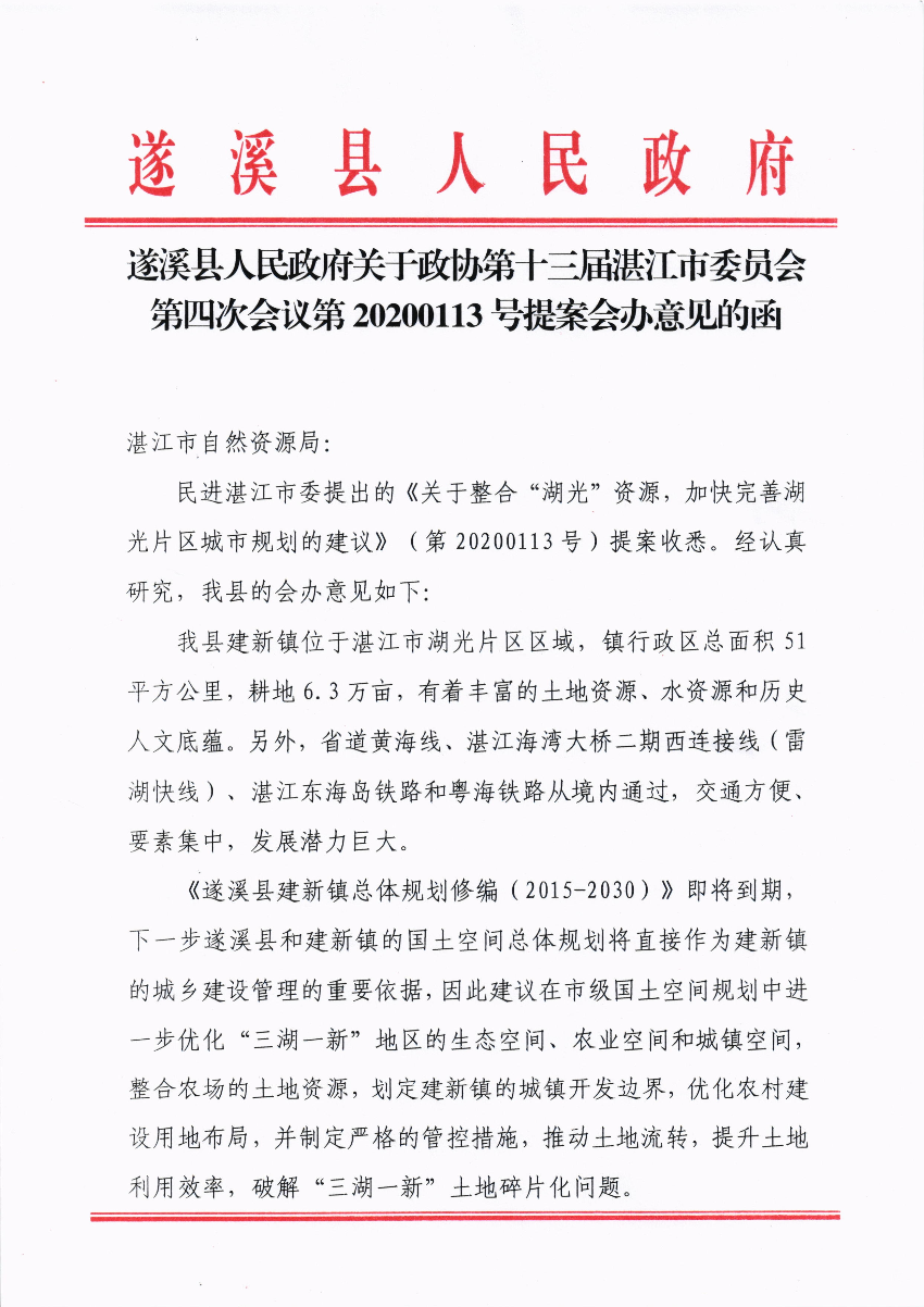 遂溪縣人民政府關于政協(xié)第十三屆湛江市委員會第四次會議第20200113號提案會辦意見的函