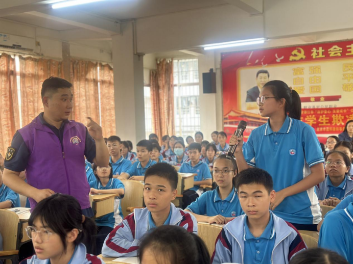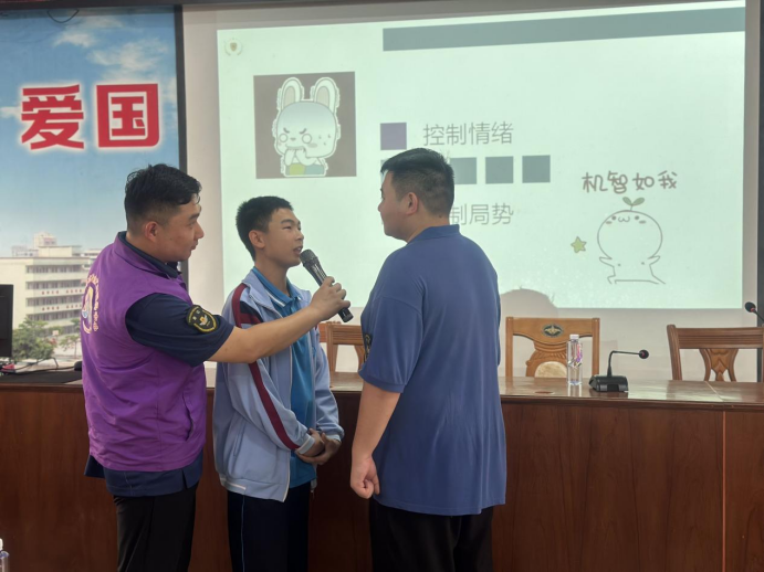教官圍繞知識儲備、防護(hù)措施、模擬演練三個內(nèi)容為學(xué)生們展開了詳細(xì)的講解。教官通過視頻、情景模擬的方式讓學(xué)生們深刻認(rèn)識學(xué)生欺凌是什么、學(xué)生欺凌的類型及危害等,從心理戒備、身體戒備、危險識別三方面加強(qiáng)學(xué)生的自我保護(hù)意識,儲備預(yù)防學(xué)生欺凌的安全知識?!罢垎柾瑢W(xué)們,剛才的行為屬于校園欺凌嗎?”“如果遇到了校園欺凌,大家知道如何自我防范嗎?”教官與學(xué)生進(jìn)行場景模擬,帶領(lǐng)學(xué)生們在體驗中學(xué)習(xí),在學(xué)習(xí)中思考,增強(qiáng)學(xué)生們的安全意識,讓學(xué)生們懂得識別危險信息,并掌握求援技巧等防護(hù)措施,引導(dǎo)學(xué)生們運用法律武器保護(hù)自己,自覺抵制各種不良行為和風(fēng)氣,拒絕學(xué)生欺凌,遠(yuǎn)離違法犯罪。