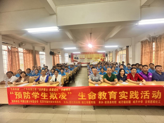 為進(jìn)一步增強(qiáng)學(xué)生抵制和防范校園欺凌的能力,提高學(xué)生的法治意識和自我保護(hù)意識。2023年5月11日下午,由中國兒童少年基金會、北京市盈科律師事務(wù)所指導(dǎo),湛江市婦聯(lián)、湛江市教育局主辦,遂溪縣婦聯(lián)、遂溪縣教育局、遂溪縣城月中學(xué)共同舉辦的“生命關(guān)愛”——廣東省湛江市“法護(hù)童心 關(guān)愛成長”公益項目“預(yù)防學(xué)生欺凌”——生命關(guān)愛公益項目社會實踐活動在遂溪縣城月中學(xué)順利開展,共有110名學(xué)生參與。