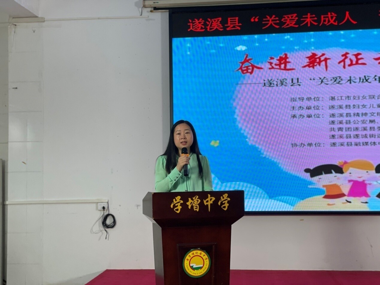 活動現(xiàn)場,遂溪縣人民政府副縣長、縣婦兒工委主任黃少娥作講話。她強(qiáng)調(diào),遂溪縣委縣政府歷來高度重視未成年人保護(hù)工作,始終把未成年人保護(hù)工作納入縣委縣政府的重要工作日程。今天,縣婦兒工委聯(lián)合各部門在黃學(xué)增紀(jì)念中學(xué)開展“關(guān)愛未成年人 預(yù)防性侵害”主題宣傳教育活動,并通過線上直播的方式在全縣中學(xué)、村(社區(qū))家長學(xué)校組織學(xué)生和家長同時收看,目的是為了向家長及未成年人廣泛宣傳《未成年人保護(hù)法》、普及性侵害防范教育知識,增強(qiáng)未成年人自我保護(hù)意識和能力,增強(qiáng)家長監(jiān)護(hù)意識,最大程度杜絕性侵害未成年人案件發(fā)生,依法保障未成年人合法權(quán)益,在全縣上下營造重視未成年人健康成長的良好氛圍。她希望同學(xué)們認(rèn)真學(xué)習(xí),并從中學(xué)會辨別哪些是性侵害,學(xué)會拒絕和防范性侵害,努力做自己身心健康的第一守護(hù)者、第一責(zé)任人;希望家長們加強(qiáng)學(xué)習(xí),增強(qiáng)監(jiān)護(hù)意識,提高家庭教育水平,切實(shí)擔(dān)當(dāng)起監(jiān)護(hù)人職責(zé)義務(wù);希望各部門切實(shí)履職盡責(zé),積極開展未成年人保護(hù)工作,在全縣下下形成政府主導(dǎo),家庭、學(xué)校、社會組織、司法機(jī)關(guān)密切配合,全社會齊抓共管的未成年人保護(hù)工作格局,為未成年人健康成長撐起一片藍(lán)天。