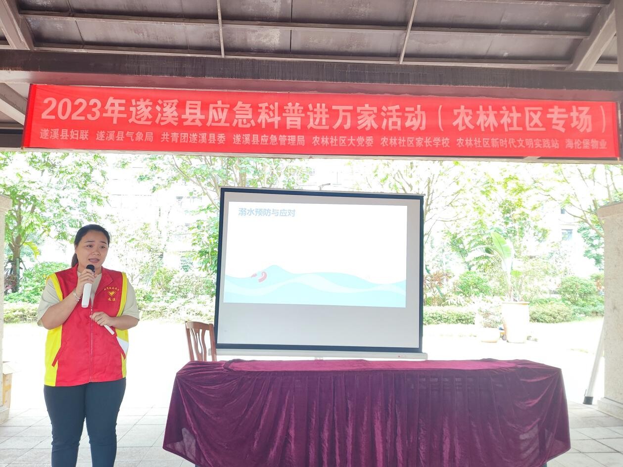 為進(jìn)一步增強(qiáng)居民防范災(zāi)害的意識和自救互救能力,普及防災(zāi)減災(zāi)知識,保護(hù)人民生命和財(cái)產(chǎn)安全,2023年11月11日上午,遂溪縣婦聯(lián)、縣應(yīng)急管理局、縣氣象局、團(tuán)縣委等部門聯(lián)合在遂城街道農(nóng)林社區(qū)海倫堡小區(qū)開展防溺水、防氣象災(zāi)害、消防安全和急救知識等應(yīng)急科普知識進(jìn)萬家活動,為家長兒童們上了一堂內(nèi)容豐富、精彩生動的應(yīng)急科普課。遂城街道農(nóng)林社區(qū)海倫堡小區(qū)約50名家長兒童參加此次活動。