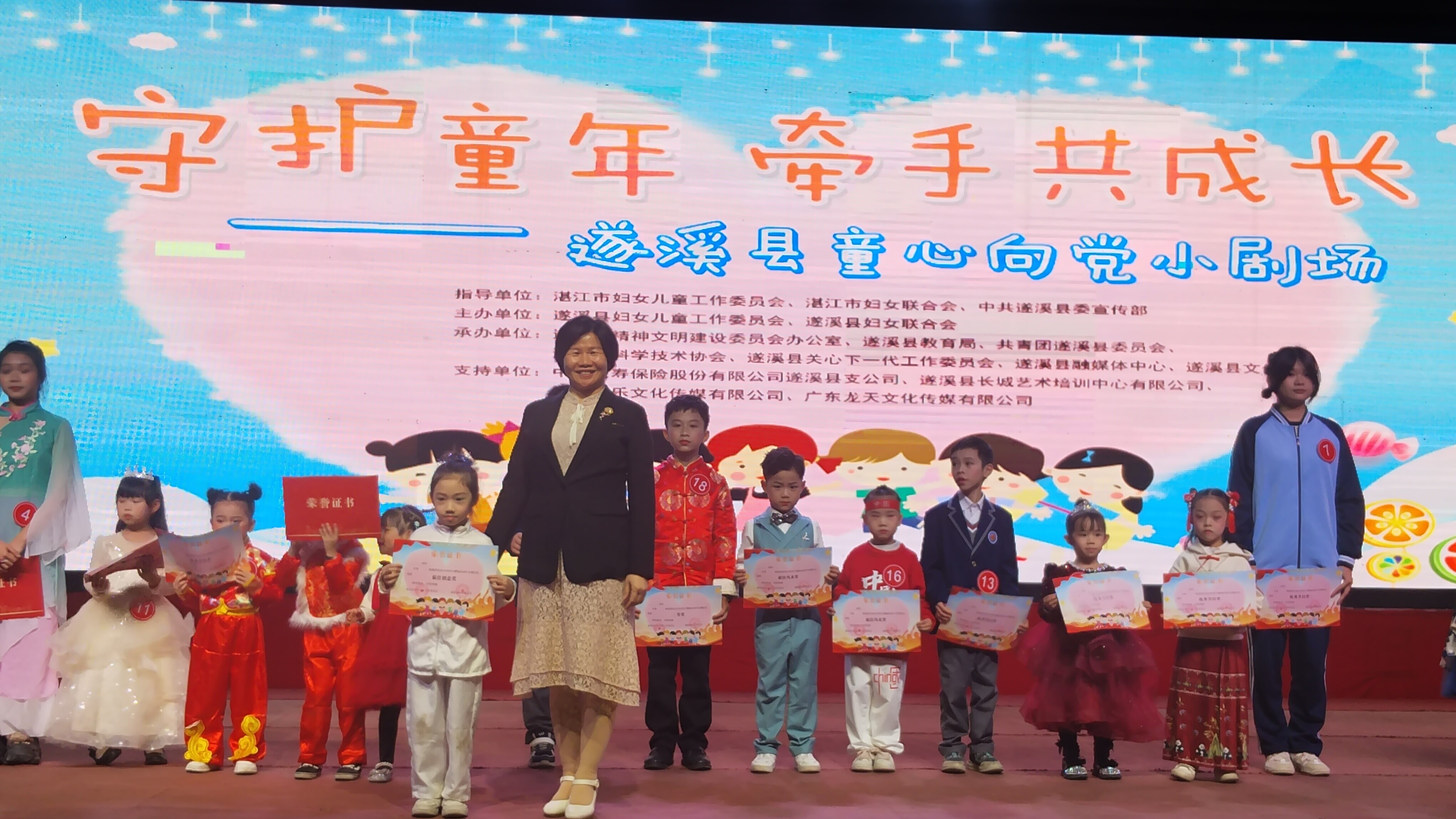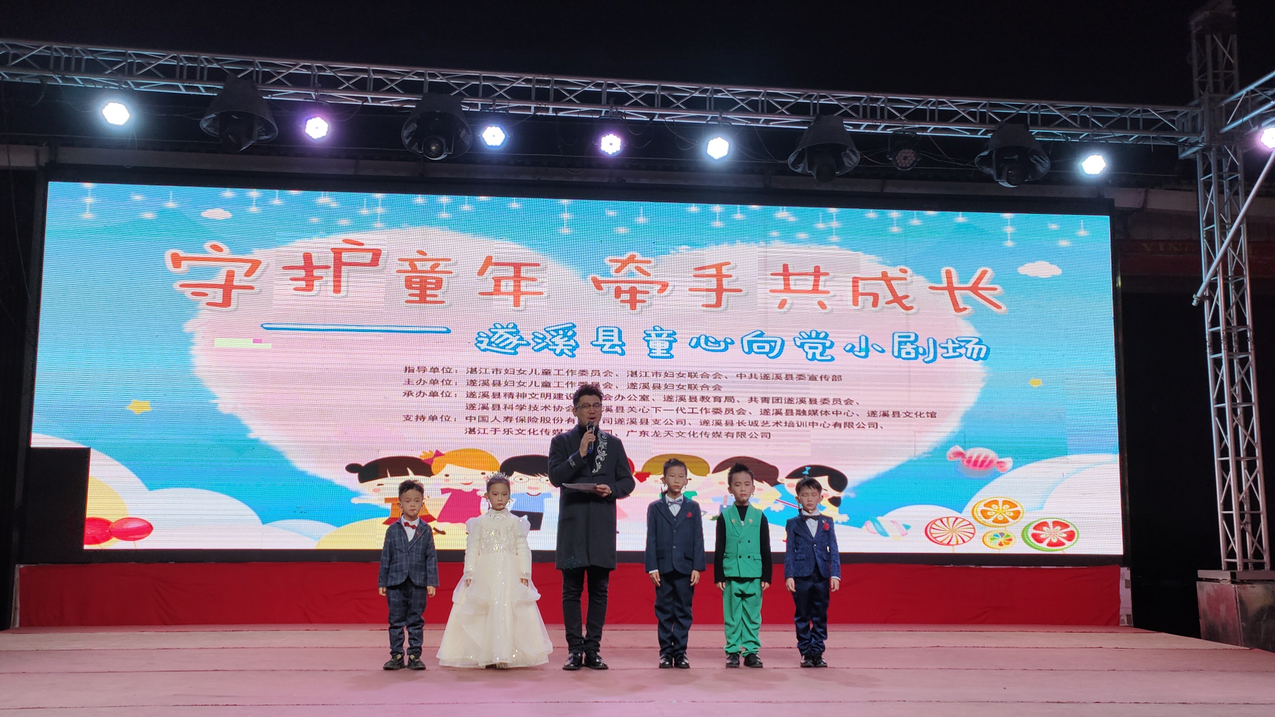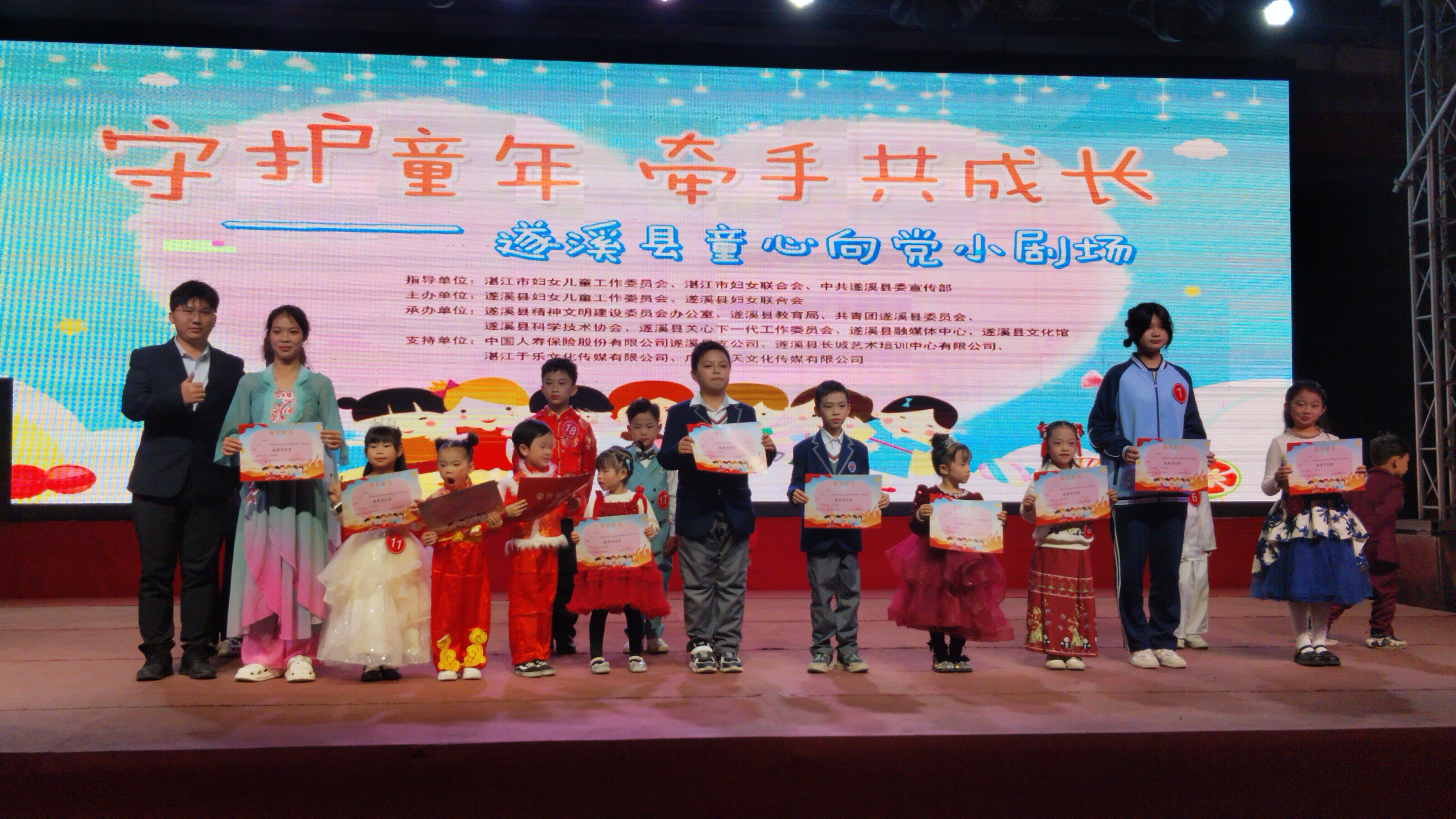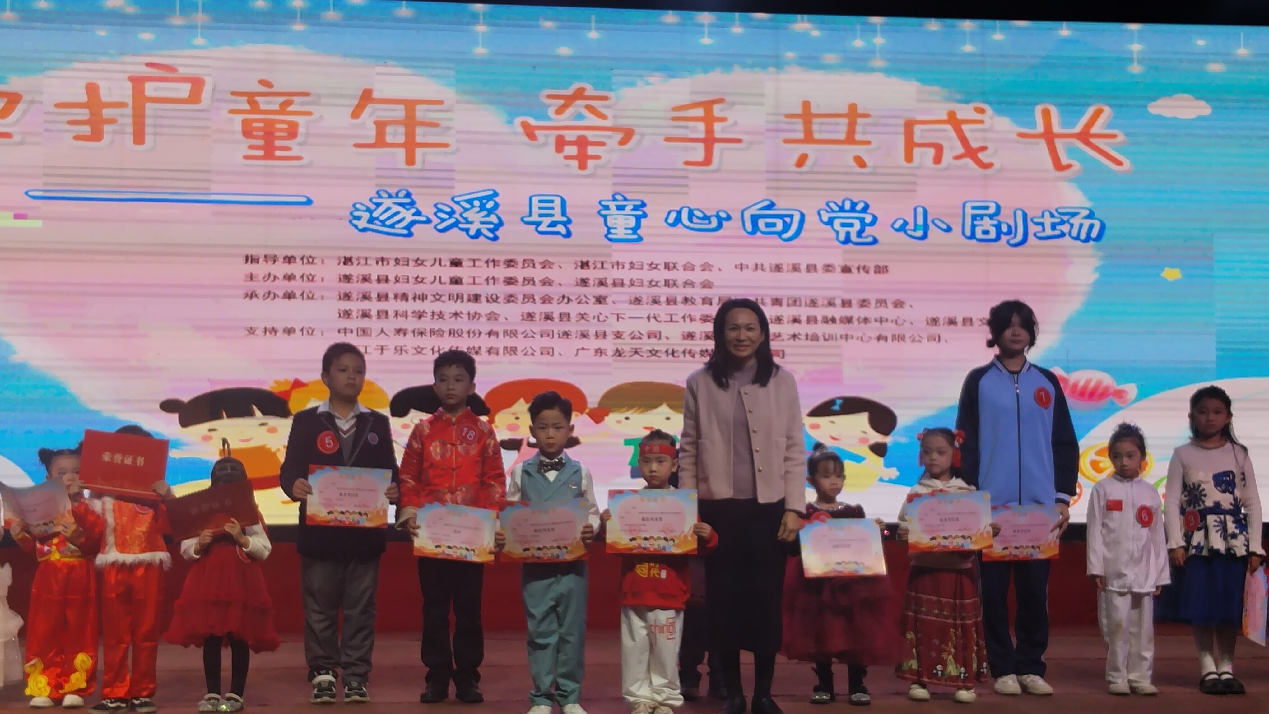 遂溪縣童心向黨小劇場由遂溪縣婦女兒童工作委員會、遂溪縣婦女聯(lián)合會聯(lián)合主辦,遂溪縣精神文明建設(shè)委員會辦公室、遂溪縣教育局、共青團遂溪縣委員會、遂溪縣科學(xué)技術(shù)協(xié)會、遂溪縣關(guān)心下一代工作委員會、遂溪縣融媒體中心、遂溪縣文化館聯(lián)合承辦,中國人壽保險有限公司遂溪縣支公司、遂溪縣長城藝術(shù)培訓(xùn)中心有限公司、湛江于樂文化傳媒有限公司、廣東龍?zhí)煳幕瘋髅接邢薰疽矊υ摶顒咏o予了大力支持。