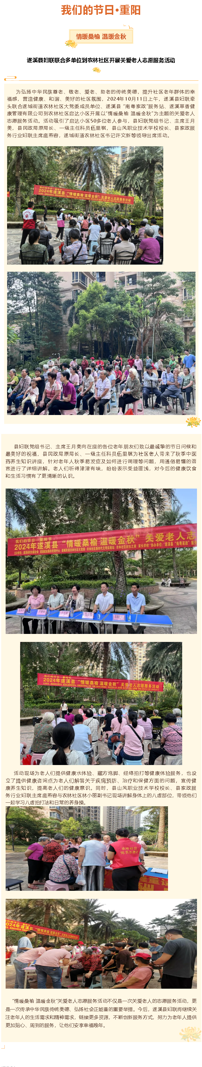 【我們的節(jié)日·重陽】遂溪縣婦聯(lián)聯(lián)合多單位到農(nóng)林社區(qū)開展2024年“情暖桑榆 溫暖金秋”關(guān)愛老人志愿服務(wù)活動