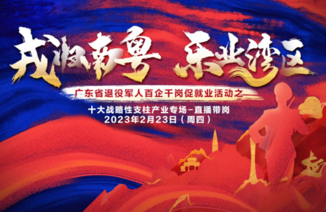 為深入貫徹黨的二十大精神,全面貫徹習(xí)近平總書記關(guān)于退役軍人工作重要論述,認(rèn)真落實(shí)黨中央、國(guó)務(wù)院和廣東省委、省政府有關(guān)決策部署,全力促進(jìn)自主就業(yè)退役軍人和隨軍家屬高質(zhì)量充分就業(yè),廣東省退役軍人事務(wù)廳舉辦的“戎歸南粵·樂業(yè)灣區(qū)”——廣東省退役軍人百企千崗促就業(yè)活動(dòng)之十大戰(zhàn)略性支柱產(chǎn)業(yè)專場(chǎng)直播帶崗活動(dòng),將于2023年2月23日14:30隆重上線。