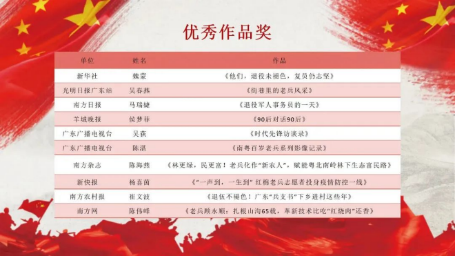 本次座談會(huì)邀請(qǐng)了省委宣傳部宣傳教育處負(fù)責(zé)同志及新華社廣東分社、總臺(tái)廣東總站、光明日?qǐng)?bào)廣東站、中國日?qǐng)?bào)廣東站、南方日?qǐng)?bào)、羊城晚報(bào)、廣東廣播電視臺(tái)等21家媒體代表參加,并為獲得2022年度廣東退役軍人新聞宣傳工作“突出貢獻(xiàn)獎(jiǎng)”“優(yōu)秀作品獎(jiǎng)”“優(yōu)秀組織單位獎(jiǎng)”的單位和個(gè)人頒發(fā)獎(jiǎng)杯和證書。