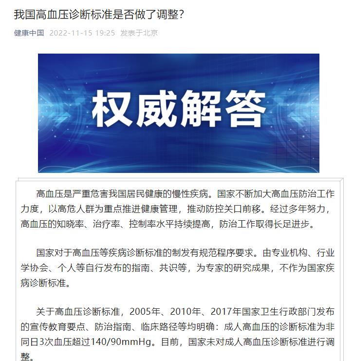 關(guān)于高血壓診斷標(biāo)準(zhǔn),2005年、2010年、2017年國(guó)家衛(wèi)生行政部門發(fā)布的宣傳教育要點(diǎn)、防治指南、臨床路徑等均明確:成人高血壓的診斷標(biāo)準(zhǔn)為非同日3次血壓超過140/90mmHg。目前,國(guó)家未對(duì)成人高血壓診斷標(biāo)準(zhǔn)進(jìn)行調(diào)整。