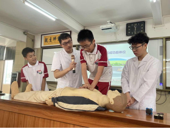 為讓師生們更快掌握心肺復(fù)蘇急救要點和心肺復(fù)蘇術(shù)操作流程,張廣博、吳國偉醫(yī)生現(xiàn)場手把手教學,師生們興趣濃厚,聽得認真、看得仔細,部分師生“躍躍欲試”,在模擬人上進行練習。在反復(fù)多次的操作練習中,部分在場的師生操作基本到位,掌握了胸外心臟按壓及人工呼吸的復(fù)蘇流程,學會了突發(fā)情況下心跳驟停的急救本領(lǐng)。