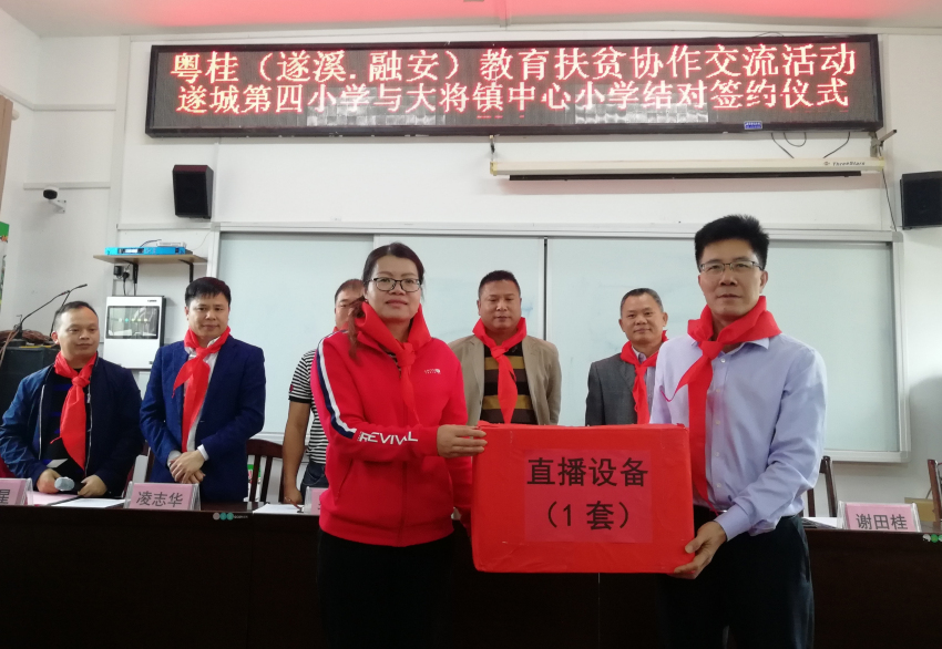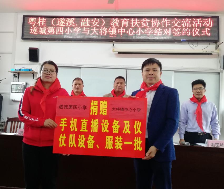 會(huì)上,遂溪縣教育局、遂城四小分別向大將鎮(zhèn)中心小學(xué)捐贈(zèng)了視頻直播系統(tǒng)設(shè)備、儀仗隊(duì)禮服和器材。