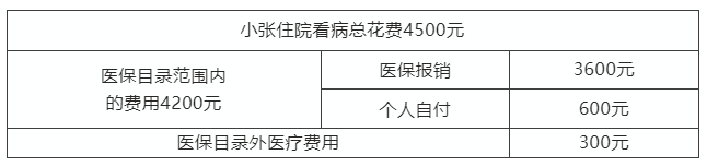 小張在醫(yī)院住院看病,總花費4500元,其中納入醫(yī)保目錄的醫(yī)療費用4200元,醫(yī)保報銷3600元,醫(yī)保目錄外醫(yī)療費用300元。