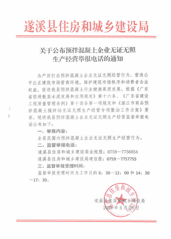 關(guān)于公布預(yù)拌混凝土企業(yè)無證無照生產(chǎn)經(jīng)營舉報電話的通知