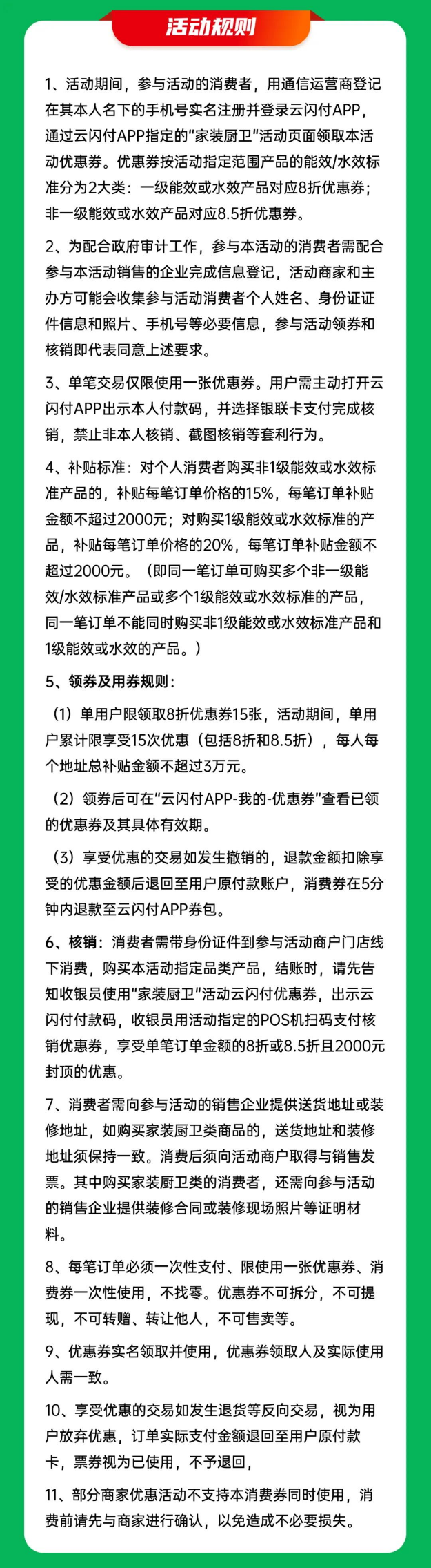 2.個人消費者需通過“活動平臺”小程序提交信息進行資格校驗,核驗通過后領取家裝廚衛(wèi)補貼資格,即可到參與活動的企業(yè)消費,補貼標準按照補貼范圍內(nèi)的產(chǎn)品銷售價格的15%進行核減,購買1級及以上能效或者水效標準的物品,額外再給予產(chǎn)品銷售價格5%的補貼核減,每人每個地址總補貼金額不超過3萬元。