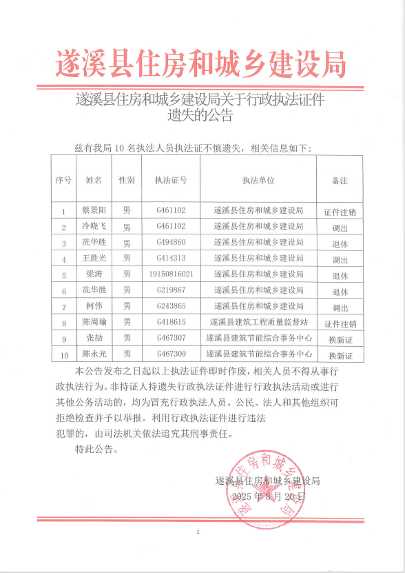 遂溪縣住房和城鄉(xiāng)建設(shè)局關(guān)于行政執(zhí)法證件遺失的公告