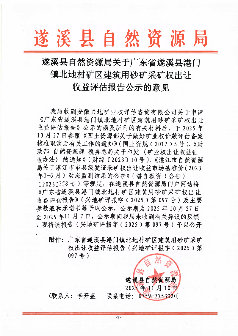 遂溪縣自然資源局關(guān)于廣東省遂溪縣港門(mén)鎮(zhèn)北地村礦區(qū)建筑用砂礦采礦權(quán)出讓收益評(píng)估報(bào)告公示的意見(jiàn)