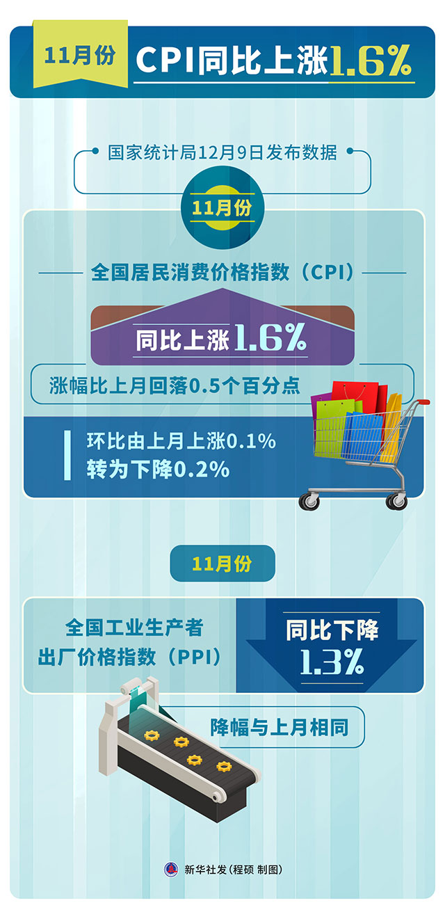國(guó)家統(tǒng)計(jì)局12月9日發(fā)布數(shù)據(jù),11月份,全國(guó)居民消費(fèi)價(jià)格指數(shù)(CPI)同比上漲1.6%,漲幅比上月回落0.5個(gè)百分點(diǎn);環(huán)比由上月上漲0.1%轉(zhuǎn)為下降0.2%。