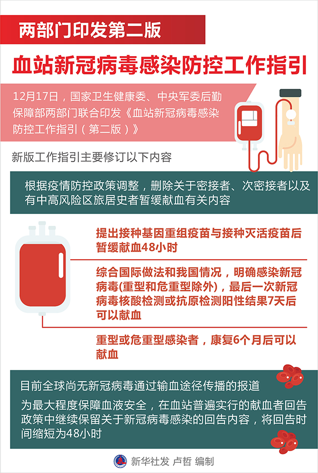 血站新冠病毒感染防控工作事關(guān)血液安全平穩(wěn)供應(yīng)。12月17日,國(guó)家衛(wèi)生健康委、中央軍委后勤保障部?jī)刹块T聯(lián)合印發(fā)《血站新冠病毒感染防控工作指引(第二版)》,指導(dǎo)采供血機(jī)構(gòu)切實(shí)做好新形勢(shì)下疫情防控工作,保障血站工作人員和獻(xiàn)血者安全,實(shí)現(xiàn)血液安全供應(yīng)。