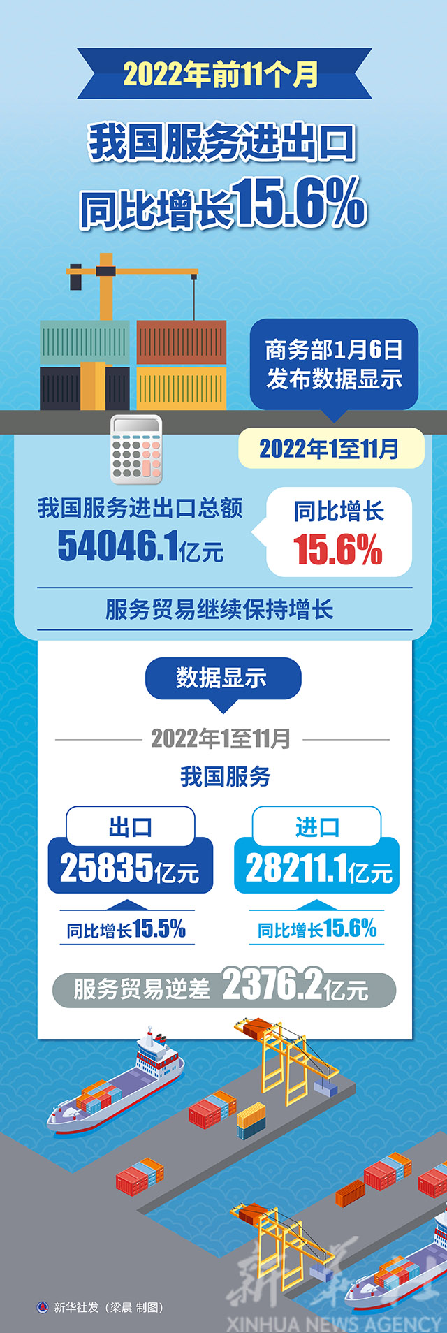 商務(wù)部1月6日發(fā)布數(shù)據(jù)顯示,2022年1至11月,我國服務(wù)進(jìn)出口總額54046.1億元,同比增長15.6%,服務(wù)貿(mào)易繼續(xù)保持增長。數(shù)據(jù)顯示,2022年1至11月,我國服務(wù)出口25835億元,同比增長15.5%;進(jìn)口28211.1億元,同比增長15.6%;服務(wù)貿(mào)易逆差2376.2億元。