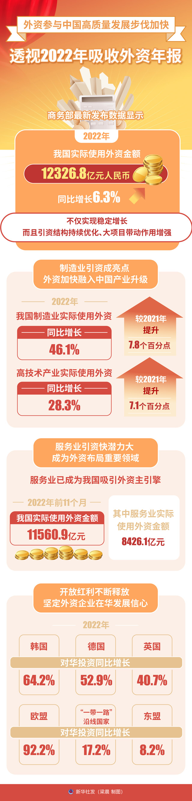 商務(wù)部最新發(fā)布數(shù)據(jù)顯示,2022年,我國(guó)實(shí)際使用外資金額12326.8億元人民幣,同比增長(zhǎng)6.3%。不僅實(shí)現(xiàn)穩(wěn)定增長(zhǎng),而且引資結(jié)構(gòu)持續(xù)優(yōu)化、大項(xiàng)目帶動(dòng)作用增強(qiáng)。印證外資企業(yè)看好中國(guó)經(jīng)濟(jì)發(fā)展前景,參與中國(guó)高質(zhì)量發(fā)展步伐加快。