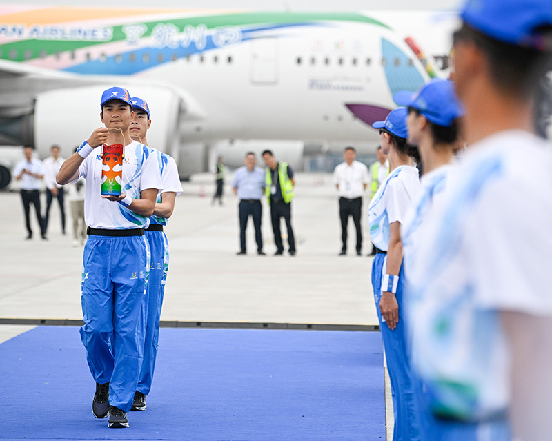 當(dāng)日,第31屆世界大學(xué)生夏季運(yùn)動(dòng)會(huì)火炬?zhèn)鬟f啟航儀式在成都天府國(guó)際機(jī)場(chǎng)舉行。在護(hù)衛(wèi)隊(duì)的守護(hù)下,成都大運(yùn)會(huì)火種順利登機(jī)。隨后,搭載著成都大運(yùn)會(huì)火種的“大運(yùn)號(hào)”飛機(jī)啟程前往北京。