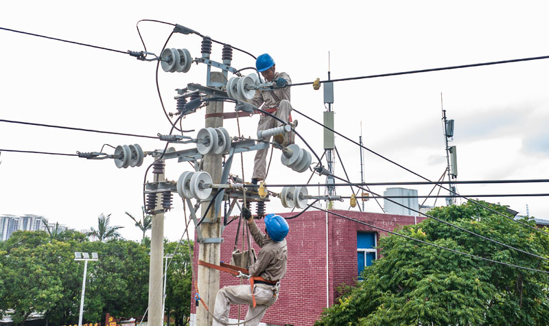 7月29日,在福建泉州肖厝社區(qū),國(guó)網(wǎng)泉州供電公司搶修人員抓緊搶修居民用電受損線路(無人機(jī)照片)。