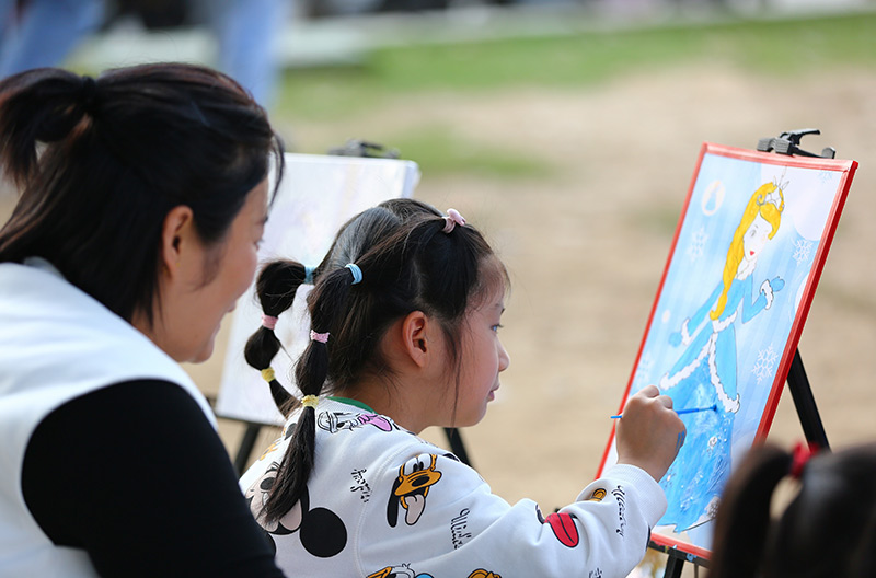 10月3日,家長(zhǎng)陪著孩子在山東省滕州市弘道公園學(xué)習(xí)繪畫(huà)。