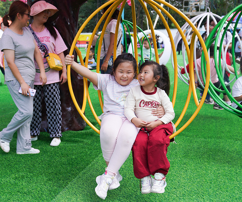 10月3日,孩子們?cè)谏綎|省鄒平市一家游樂(lè)園游玩。