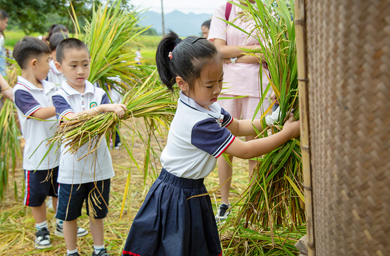 10月2日,在福建省武夷山市下梅村,小朋友在體驗(yàn)手工打谷。