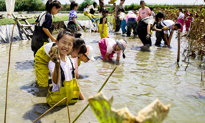 10月3日,小朋友在浙江省寧波市北侖區(qū)郭巨街道古鎮(zhèn)蓮園體驗(yàn)采收蓮藕。