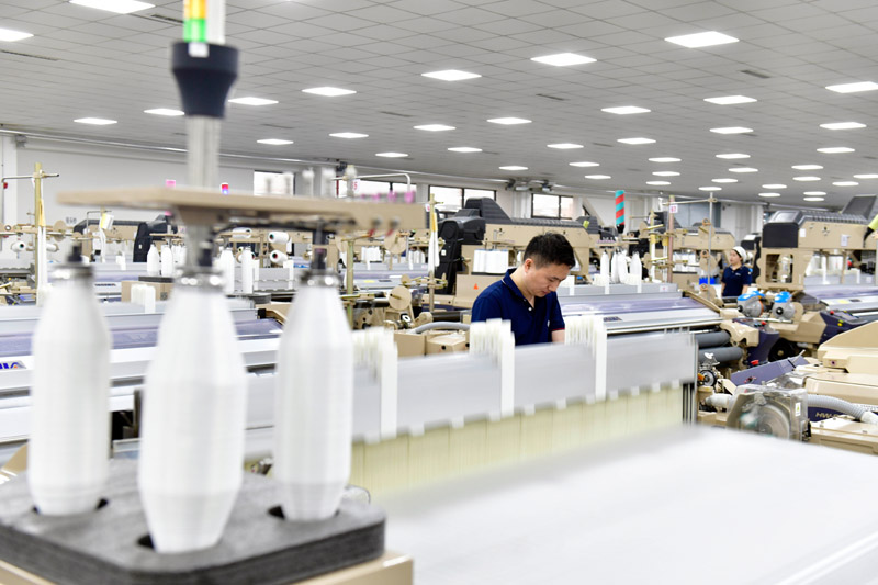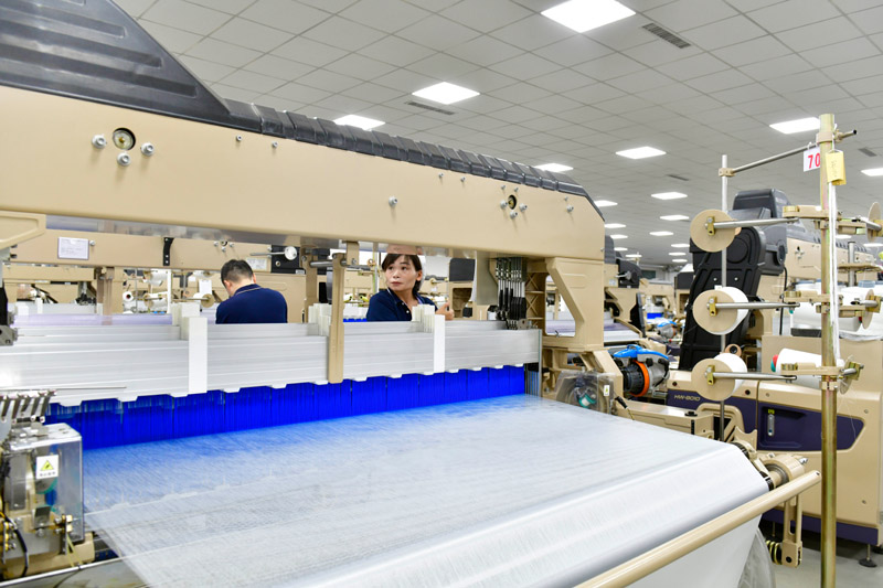 10月29日,在山東勁拓新材料科技有限公司,工作人員在導電布生產(chǎn)設(shè)備前值守。