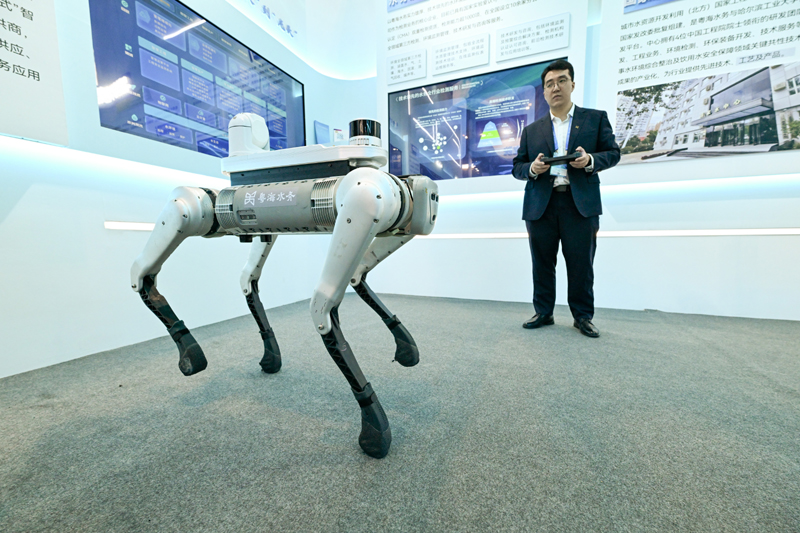 11月15日,在第二十五屆高交會上,工作人員展示用于巡檢的四足機(jī)器人。
