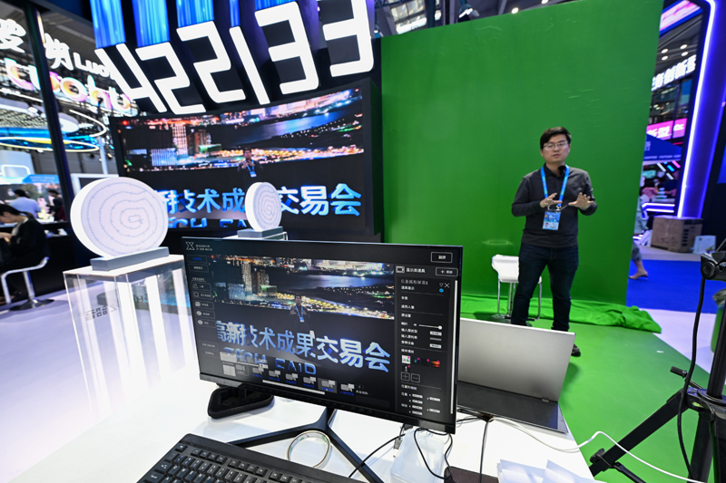11月15日,在第二十五屆高交會上,工作人員展示一款使用人工智能和即時渲染算法合成的虛擬直播間。